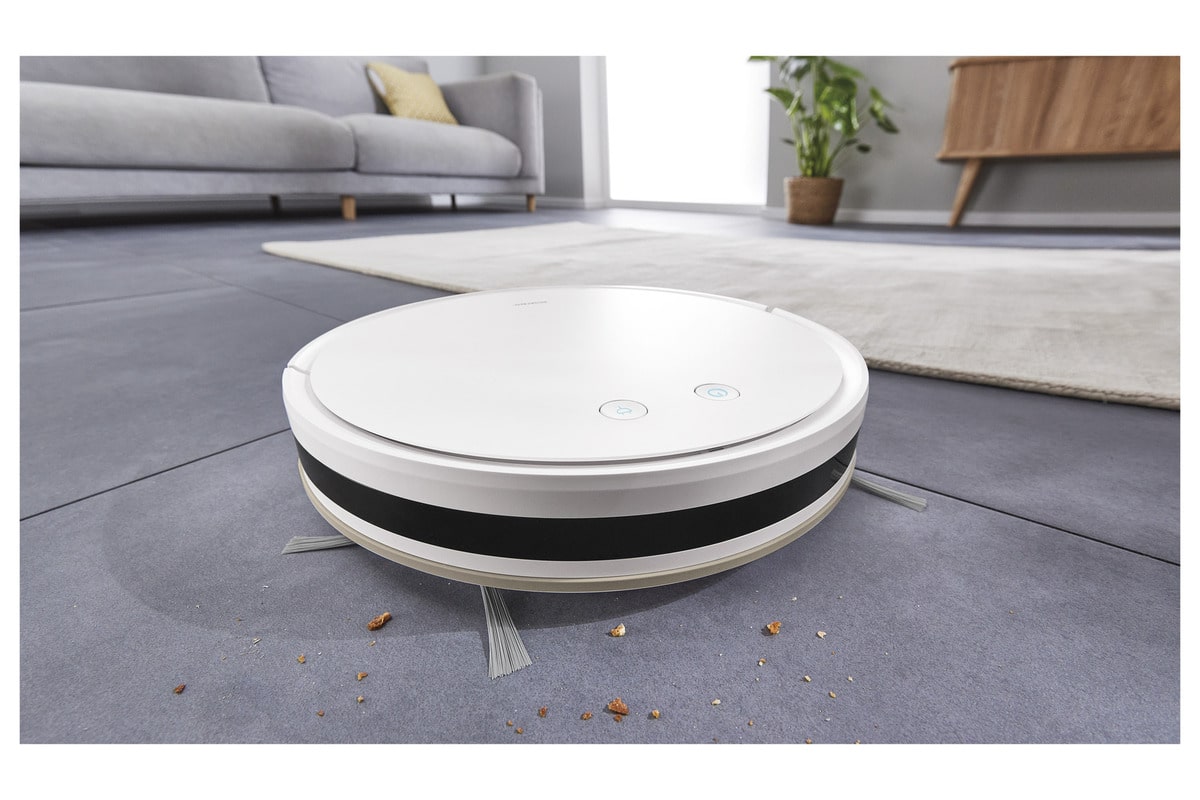 En plus de l’aspirateur robot lui-même, le paquet comprend une station de charge, un adaptateur secteur, une télécommande avec 2 piles AAA, 2 brosses latérales de rechange, 1 filtre de rechange et 1 brosse de nettoyage. Avec une autonomie allant jusqu’à 100 minutes en mode ECO, il est adapté aux espaces d’environ 90 m². Le bac à poussière a une capacité d’environ 400 ml, et l’appareil fonctionne à un volume sonore d’environ 68 dB en mode ECO.
